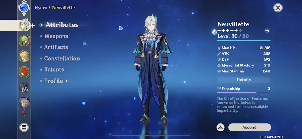 This is a Genshin Impact reroll account featuring Neuvillette on your chosen server: