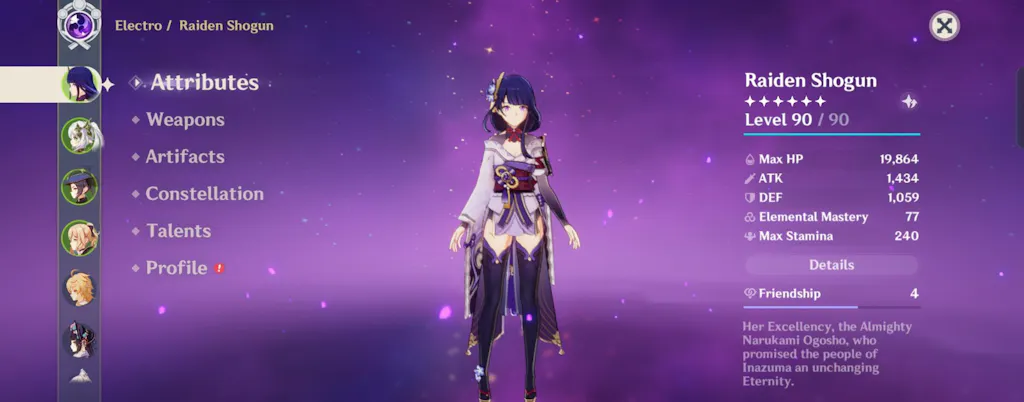This is a Genshin Impact reroll account featuring Raiden Shogun on your chosen server: