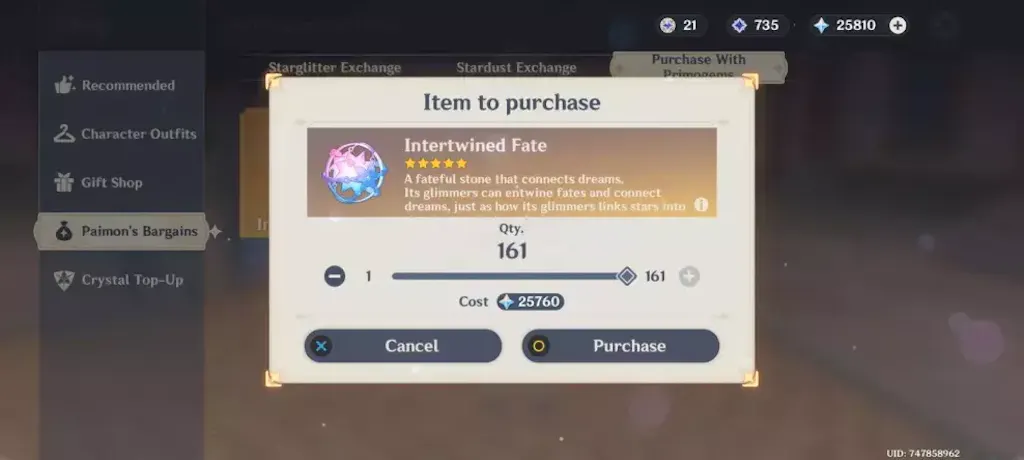 - Primogems and Fates as shown in the image
